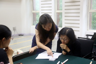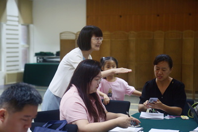 在口语工作坊中,高淼副教授基于现有考试的口语测评任务框架,与参班教师探讨如何设计口语任务,并指导参班教师根据真实情境设计口语测试任务和评分方式。