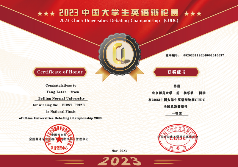 外文学子荣获全国大学生英语辩论赛(CUDC)全国总决赛一等奖