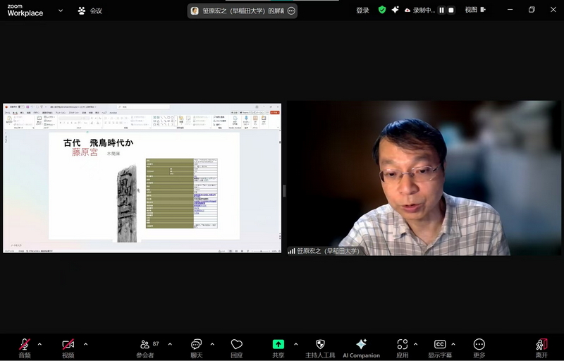 开幕式结束后,早稻田大学笹原宏之教授以“汉字字义的日本本土化”为题开启第一讲。在70多分钟的时间里,笹原教授以“餅”、“袴”、“畳”、“桜”、“蛯”五个汉字为例,通过中、日各类历史文献及金石文资料,追溯了汉字在日传过程中如何因为自然风土、社会生活、文化的不同而发生本土化演变,这是一场探索汉字的起源及其在异域生长的奇妙之旅。在问答环节,来自校内外的师生积极与笹原教授展开面对面的交流,并将话题进一步延展。