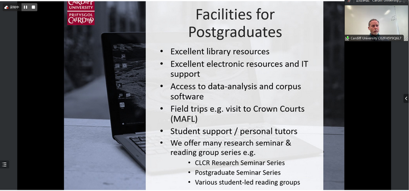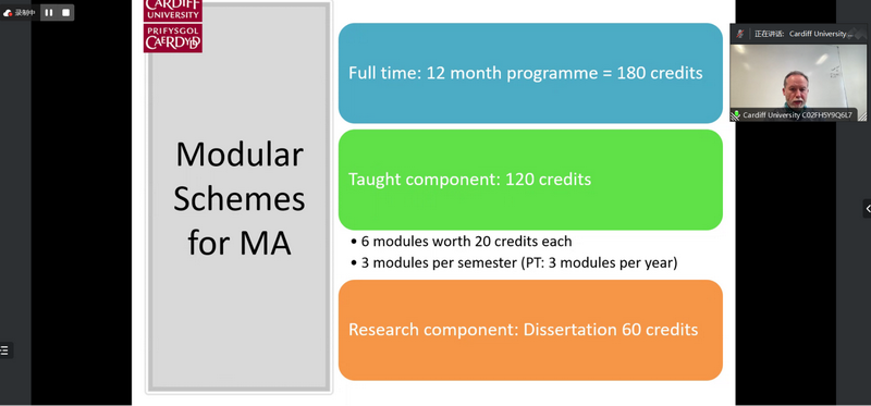 首先,Handford教授介绍了卡迪夫大学所处的地理环境、历史沿革、学院组成等,并着重介绍了英语、传播与哲学学院的基本概况。Handford教授强调,学院拥有丰富的学术资源、多元的文化氛围和强大的导师支持团队,为学生的发展提供了广阔的平台。接着,Handford教授详细说明了该项目不同方向的具体课程结构和申请要求。