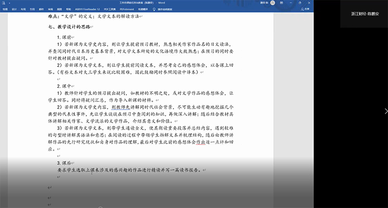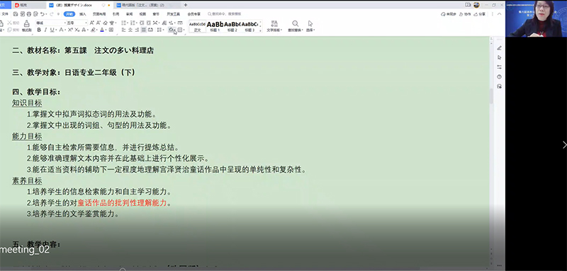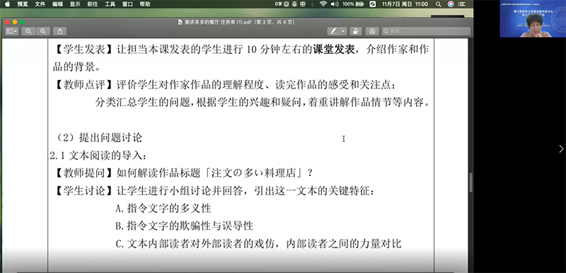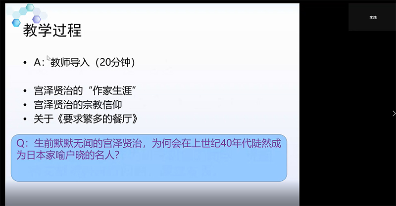 7日上午9时,大会进入工作坊成果发布的阶段。参加工作坊的三个组老师均选派一名成员,在线汇报本组所设计的教学方案。首先介绍本组所归纳的需要改进的问题以及改进的策略,随后具体介绍教案的内容,主要包括:课程名称、教学对象、教学目标、教学内容、课时安排、教学过程、教学方法、评价方法等。每个组汇报展示之后,情色直播 日文系的王志松老师、林涛老师、冷丽敏老师、林洪老师依次点评。点评的要点涉及文本的处理、切入点的确定、教学目标的合理性及可操作性、教学流程的逻辑性、教学目标与评价的关系等环节。