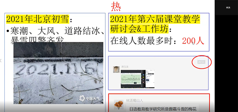 自2009年首届高校日语课堂教学研讨会暨教学工作坊以来,本次研讨会暨工作坊实现了四个首次:首次在线举办,首次由北师大外文学院日文系的教师承担全部的主旨报告、示范说课,首次由北师大外文学院日文系的教师承担全部说课的点评,首次参会人数突破百人(此前线下的会议,均设计为小规模的60人以内。本次改为线上后,听取首日上午的主旨讲演和示范说课的在线人数最高达200人,听取次日说课及点评环节的在线人数最高逾90人)。